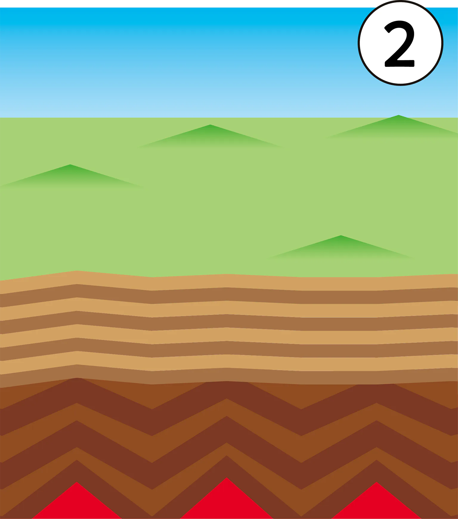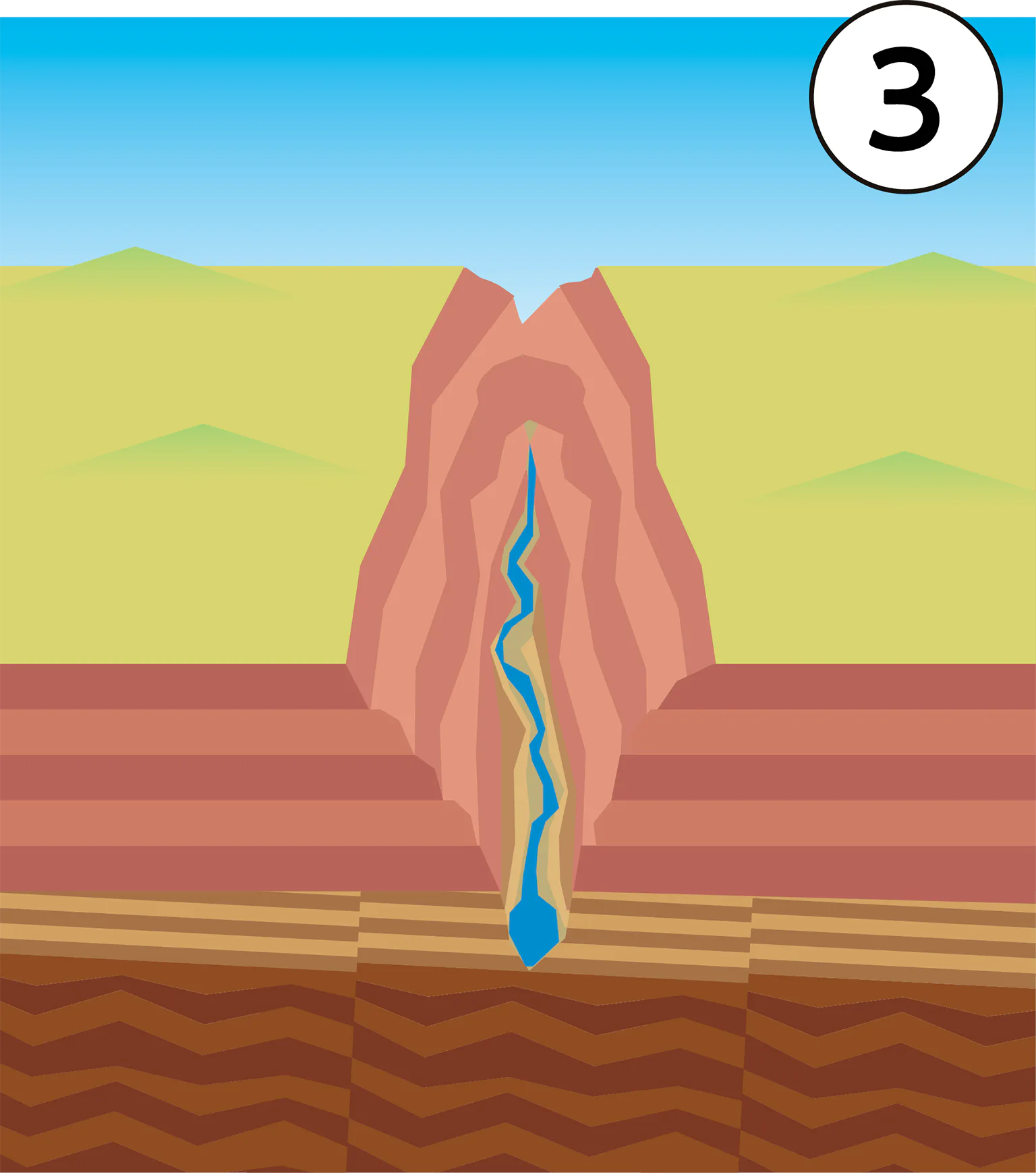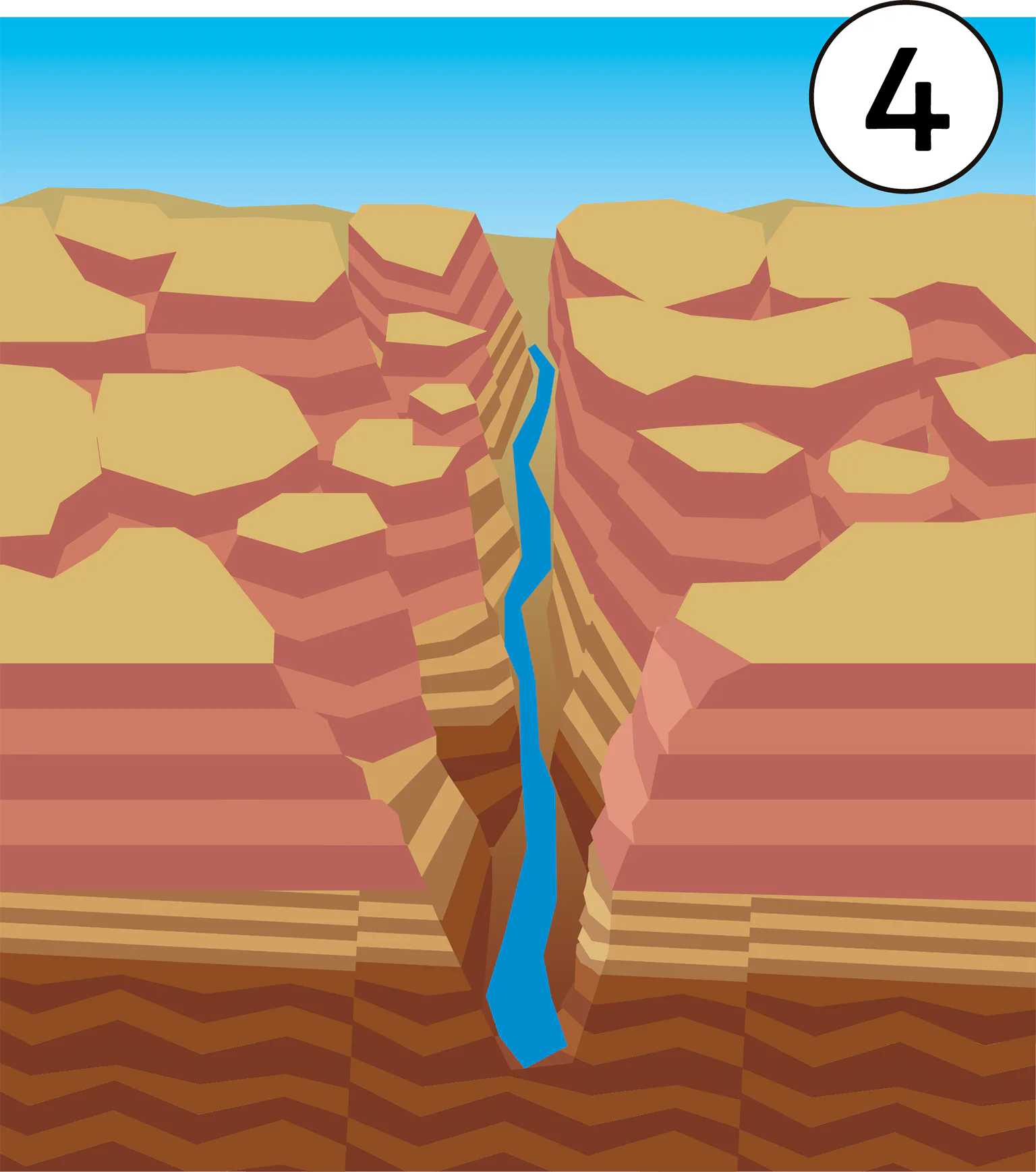 長い時をかけて削られた山は12億年前には平原となり、何回もの地殻変動によって陸と海底を繰り返し、4億年前にはまた陸となった。その地殻変動で生じた断層の痕跡がコロラド川の川岸に見られる。