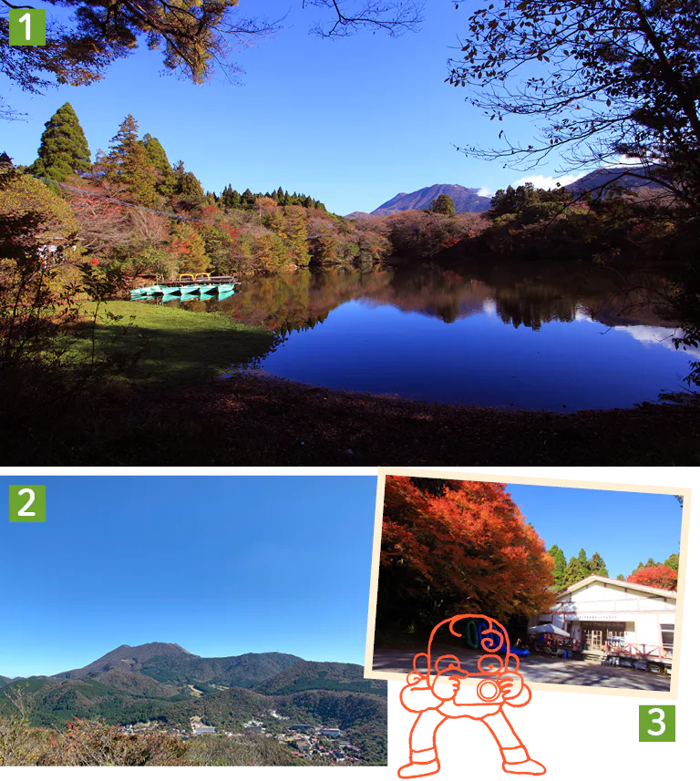 1.晴れた日は平成新山が遠望でき、水面に紅葉が映る光景は絵画のような美しさ/2.標高870mの絹笠山頂上からの景色/3.管理棟もあり、キャンプのほかパックラフト(一人乗りボート)体験やガイドツアーも人気(要予約)