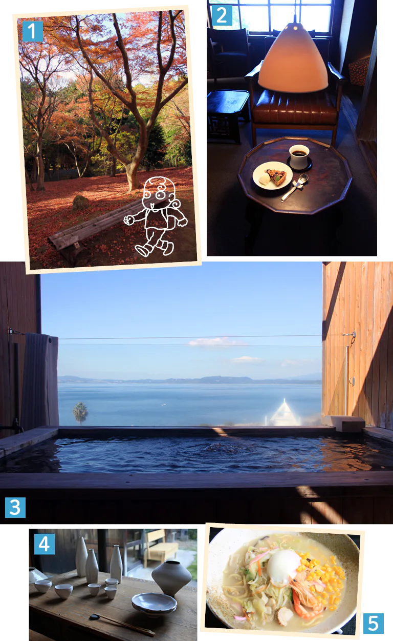 2日目は少し早めにチェックアウトをすませ、路線バスで小浜温泉へ。途中で立ち寄りたいのは、長崎県屈指の紅葉スポット「三十路苑」。個人の敷地約8,000坪に広がる絵巻のような紅葉は、歩くだけで心が躍るフォトジェニックな景色。小浜温泉に到着したら、湯けむりが立ちのぼる海岸通りを歩き、日本一長い足湯「ほっとふっと105」へ。潮風を浴びながら足先からじんわりと温まろう。ランチは、名物の小浜ちゃんぽんを。魚介のスープが体に染みわたる。また、小浜は路地裏散策も楽しい町で、レトロな建物や史跡、こだわりの小さなお店も点在する。なかでも、細い坂道を上った先にあるショップ&喫茶「刈水庵」は、デザインにこだわった質の高い食器類や雑貨に出合える、コーヒーやハーブティーもおいしいお店。旅の締めくくりは、橘湾を一望する絶景露天風呂で。時間とともに移ろう絶景を独り占めでき、旅の最後にふさわしい贅沢なひとときを過ごせる。