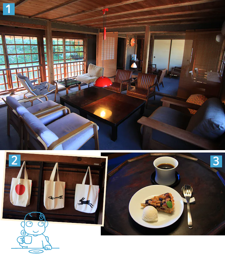 1. 2階の喫茶。特に窓際の席はひとりでも気兼ねなく過ごせるのでおすすめ/2.旅の思い出に欲しくなる素敵な雑貨や小物/3.デザートセット1000円。好きな飲み物が選べる