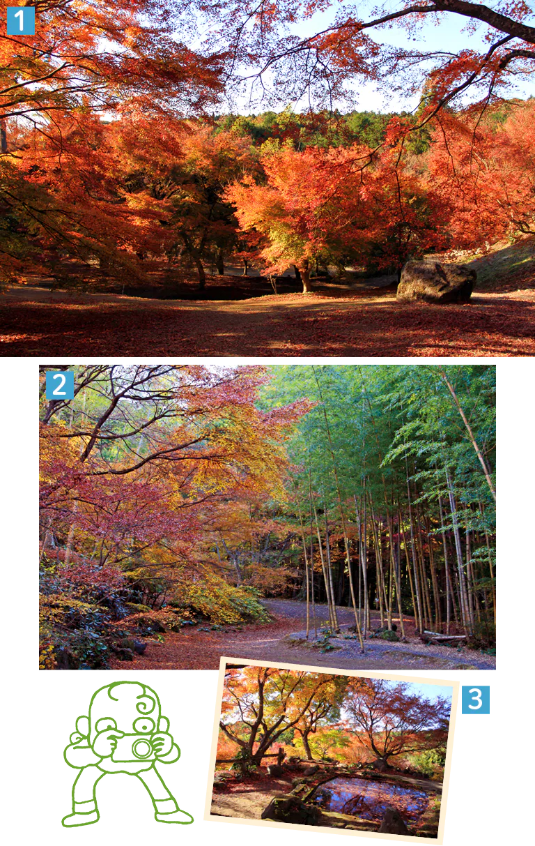 1.8000坪のなだらかな敷地に無数の紅葉樹が広がる/2.竹林と紅葉のコントラストも美しい/3.水面に映る紅葉と水面に浮かぶ紅葉のコラボレーションが楽しめる