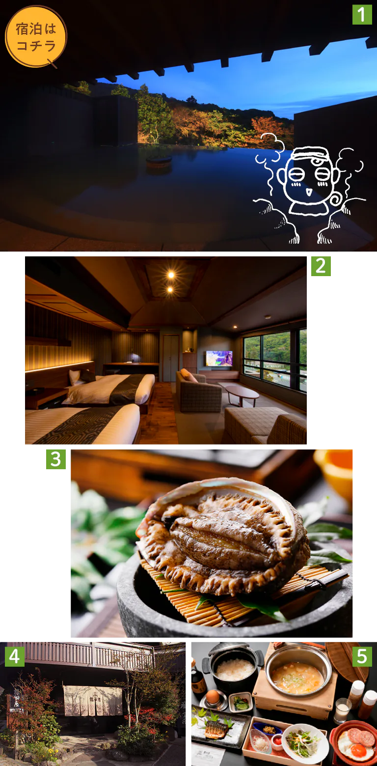 1.本格サウナも併設された絶景パノラマ露天風呂「薫風の湯」(男女朝夕入替)/2.ひとり旅プランで利用するスタンダードツイン/3.じっくり味わいたいアワビの溶岩焼き/4.小地獄入口バス停前にある/5.「眼福カラダがよろこぶ健康朝ごはん」で体の中からリフレッシュ