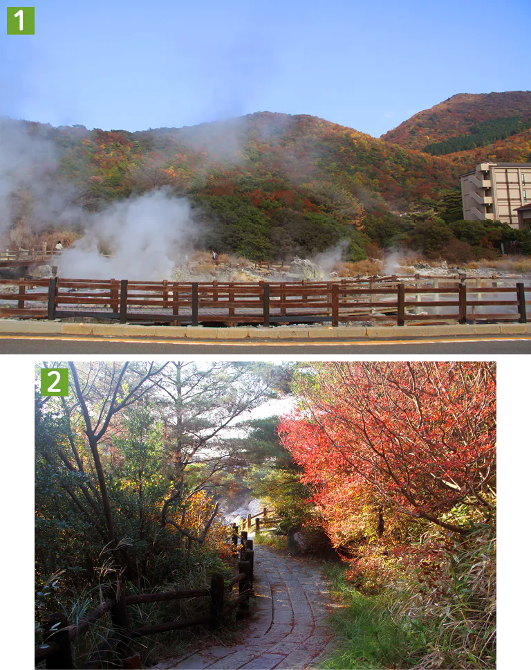 1.雲仙地獄からは紅葉した雲仙の山々を眺められる/2.紅葉の時期の雲仙地獄の遊歩道