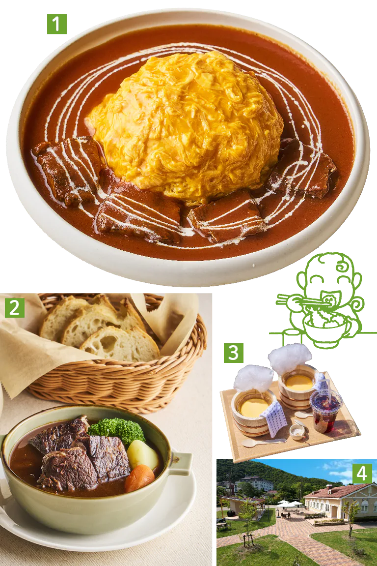 1.雲仙オムハヤシ1800円。ふわとろ卵とチーズとコクのあるハヤシソースがベストマッチ/2.雲仙牛ビーフシチュー2400円/3.雲仙湯けむり塩プリン800円。湯けむりに見立てた綿飴付き。別添えの小浜温泉「塩の宝石」をかけて食べる/4..外のテラスはフリースペース。敷地の一角には源泉かけ流しの足湯もある