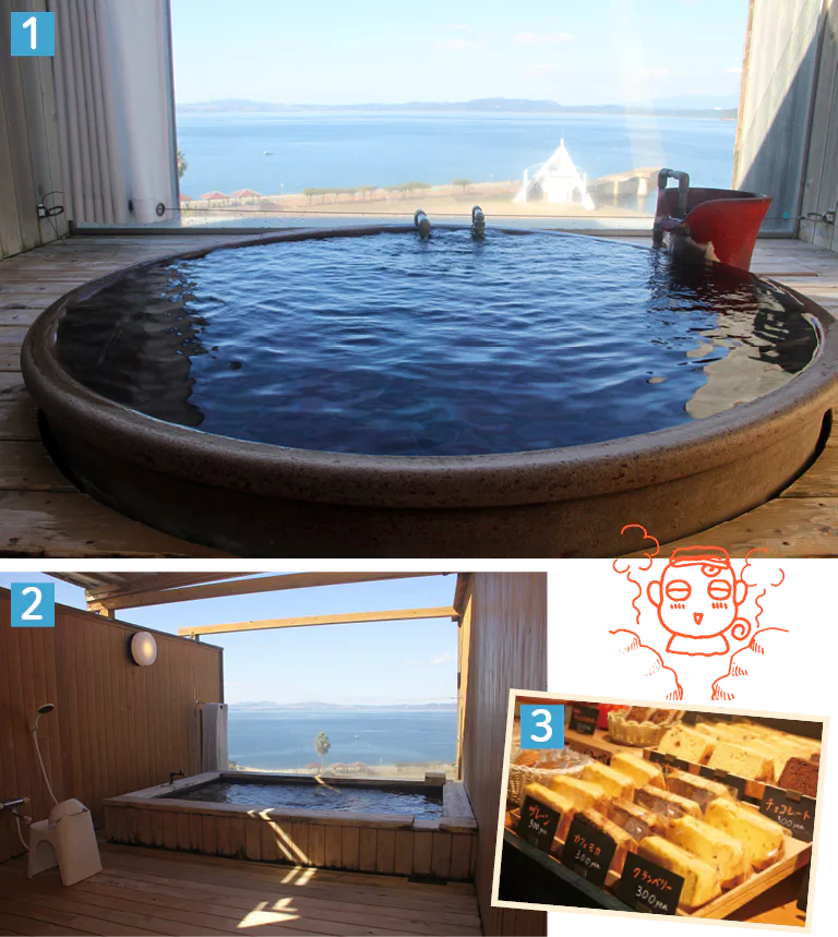 1.丸い形が可愛い信楽焼で作られた陶器風呂「晴天の湯」/2.木の香りと赤御影石の感触が優しい「普賢の湯」/3.1階のカフェラウンジ「ineca」では米粉を使ったシフォンケーキ(プレーン、カフェモカ、グランベリーなど、1個300円)のほか米粉の焼き菓子やパンを販売