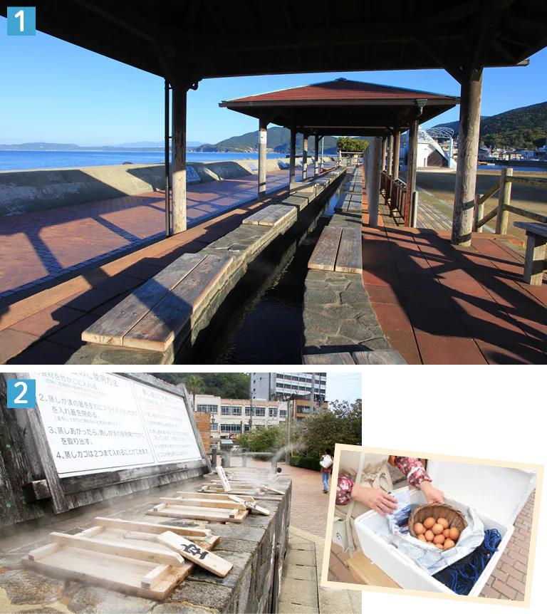 1.愛犬と一緒に足湯を楽しめるスペースもある/2.隣接の蒸し釜では好きな材料を持ち込んだり、釜の前で販売している卵や野菜などを買ってセルフサービスで蒸して食べることができる。蒸し釜最終受付は17時30分(4〜10月は18時30分)