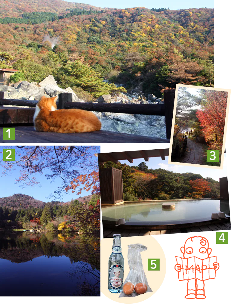 1.雲仙地獄の湯けむり/2.白雲の池の水面に映る紅葉/3.雲仙地獄の紅く色づいた遊歩道/4.雲仙福田屋の展望露天風呂からの眺め/5.雲仙地獄内のお糸地獄近くにある雲仙地獄工房で販売している名物の温泉たまご(2個200円)と温泉レモネード(300円)