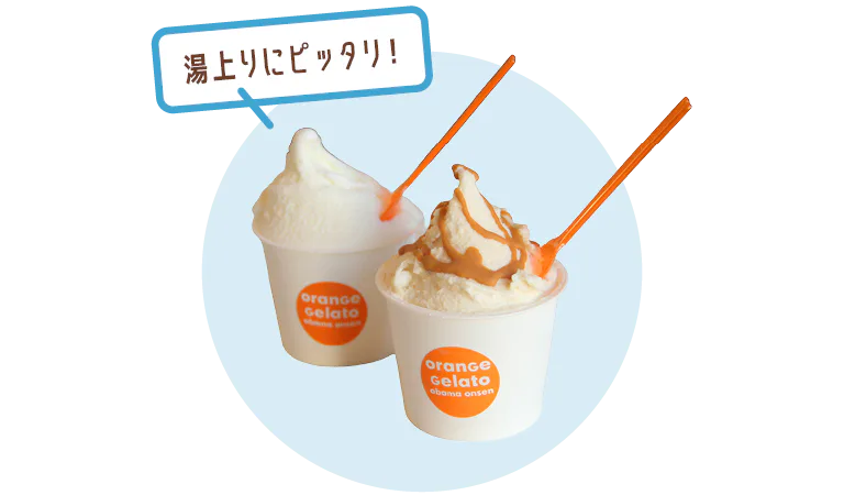 今や小浜温泉の名物になっている「ORANGE GELATO」の自家製ジェラートアイス。小浜の塩ミルクなど13種類が揃う。シングル450円。海辺のお宿つたやから徒歩3分、小浜ターミナルまでは徒歩7分のところにある。