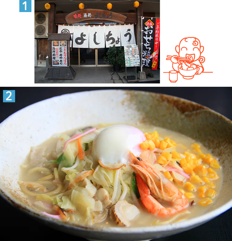 かつて長崎と小浜は定期航路で結ばれていて、その交流の中から生まれたのが小浜ちゃんぽん。店主の高祖父は大正時代に小浜で「松月楼」というちゃんぽん店を創業した人物。1階は日帰り温泉(食事利用で無料)、2階が食事処で、看板メニューのちゃんぽんのほか、寿司や定食、丼ものなどラインナップが豊富。