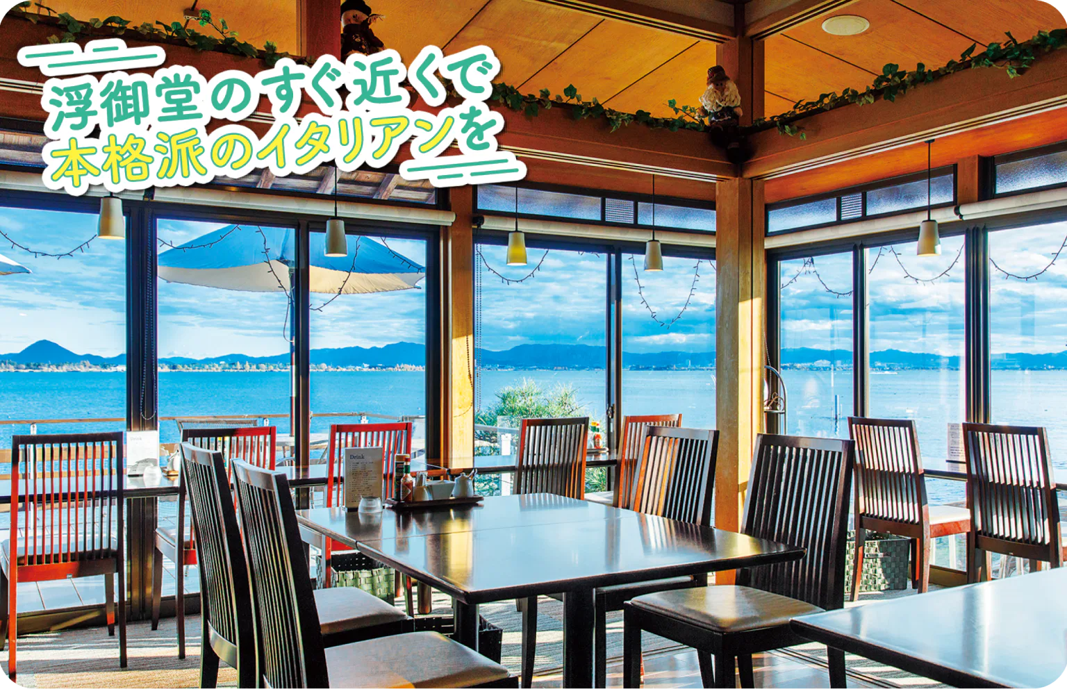 湖畔のイタリアンレストラン。ランチはピザ、ビーフシチュー、ドリアなどがそろい、時間制限がないのでゆったり過ごせる。カフェタイムには、スイーツピザやパンケーキを。