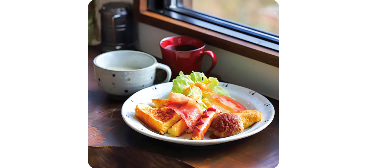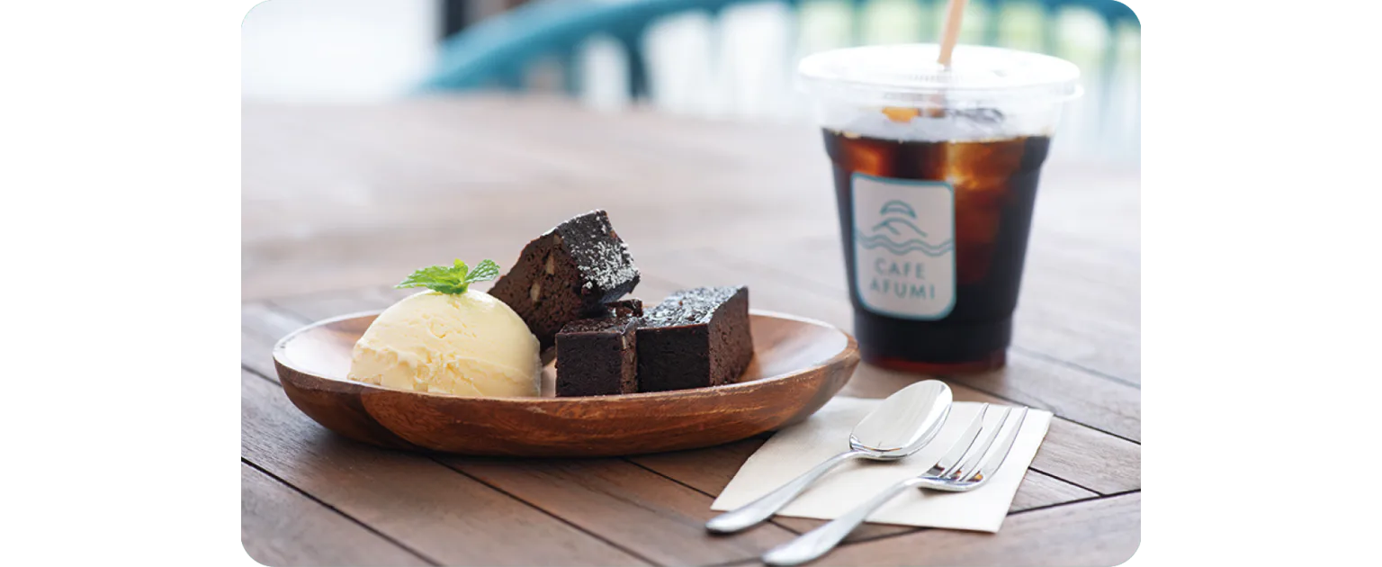 グランピング施設「AFUMI KITAKOMATSU」併設のカフェ。高島名物「とんちゃん」をのせたチキンオーバーライスや、彦根の焙煎所から仕入れるコーヒーなど、滋賀ゆかりのランチやティータイムを。