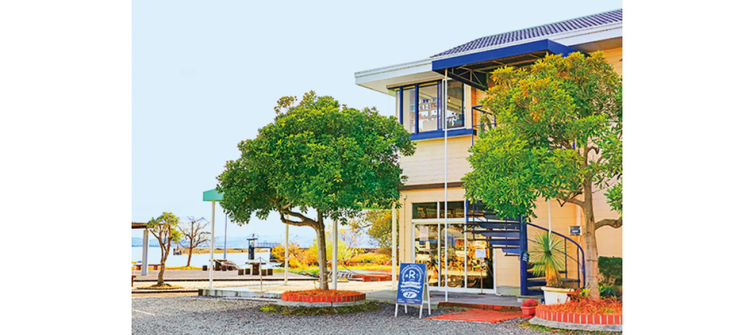 水ヶ浜ビーチの元キャンプ場に立つログハウス風のカフェ。室内席もあるが、おすすめはテラス席。湖上を渡る爽やかな風を感じながらランチやスイーツが楽しめる。