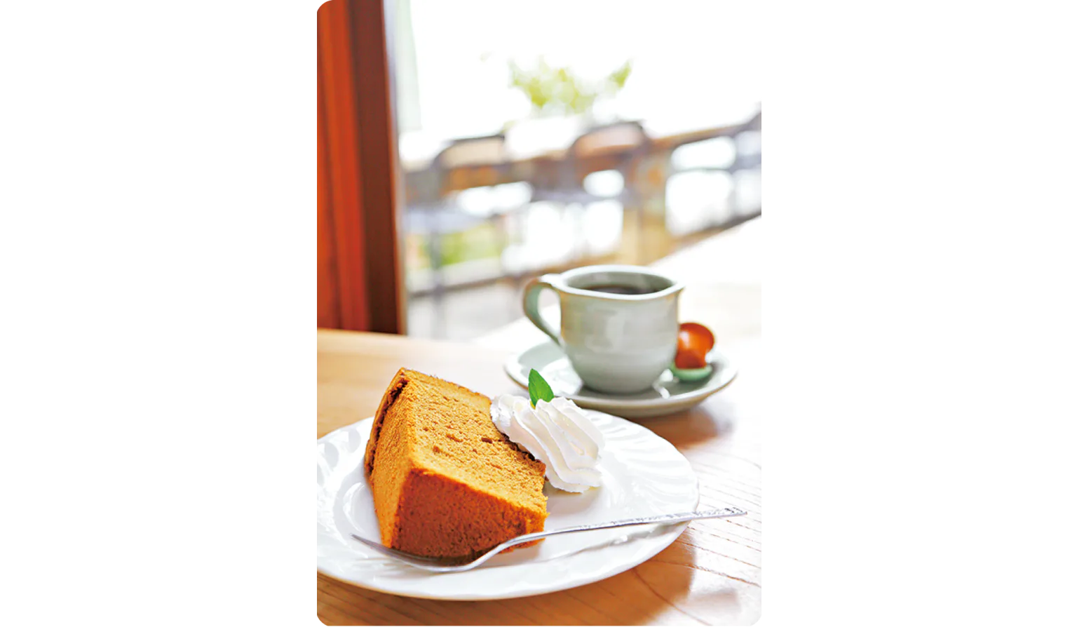5種のケーキから選べる「ケーキセット」900円。写真は一番人気のシフォンケーキとコーヒーのセット