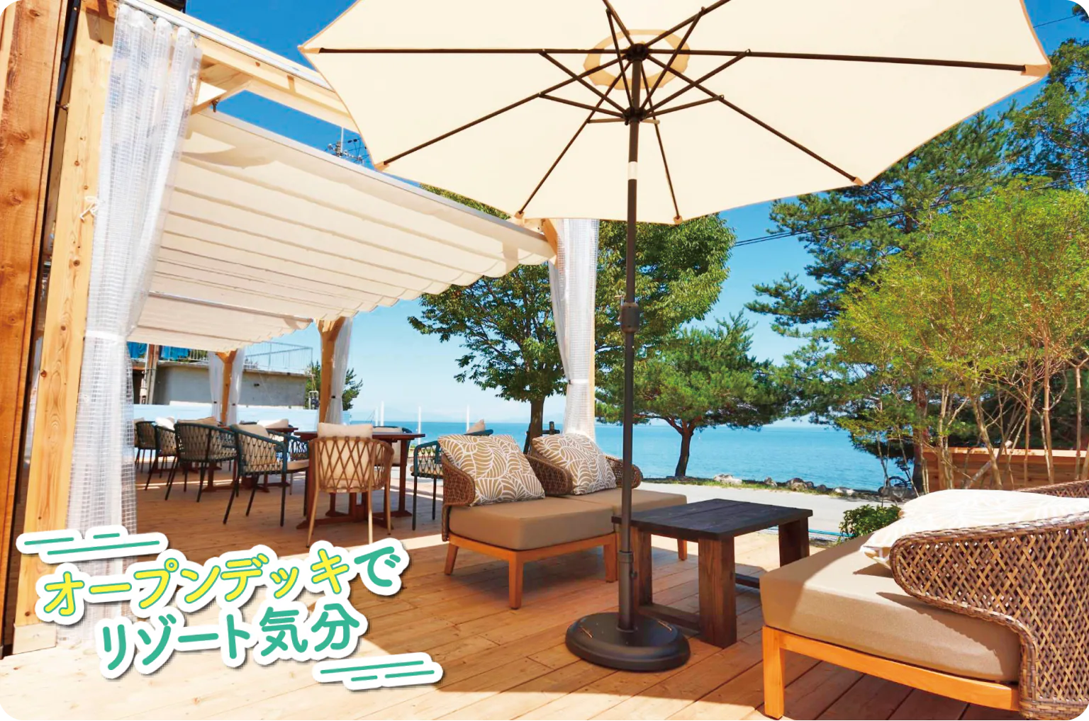 浮御堂や琵琶湖大橋まで望むテラス席は、湖上を吹き渡る風も心地いい