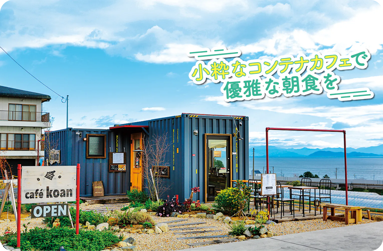 海上輸送用のコンテナをアレンジしたカフェ。滋賀県在住歴30年のオーナー夫妻が醸す空気感と窓辺に移ろうのどかな景色が魅力。天気予報が晴れの日曜限定でサンライズカフェも。