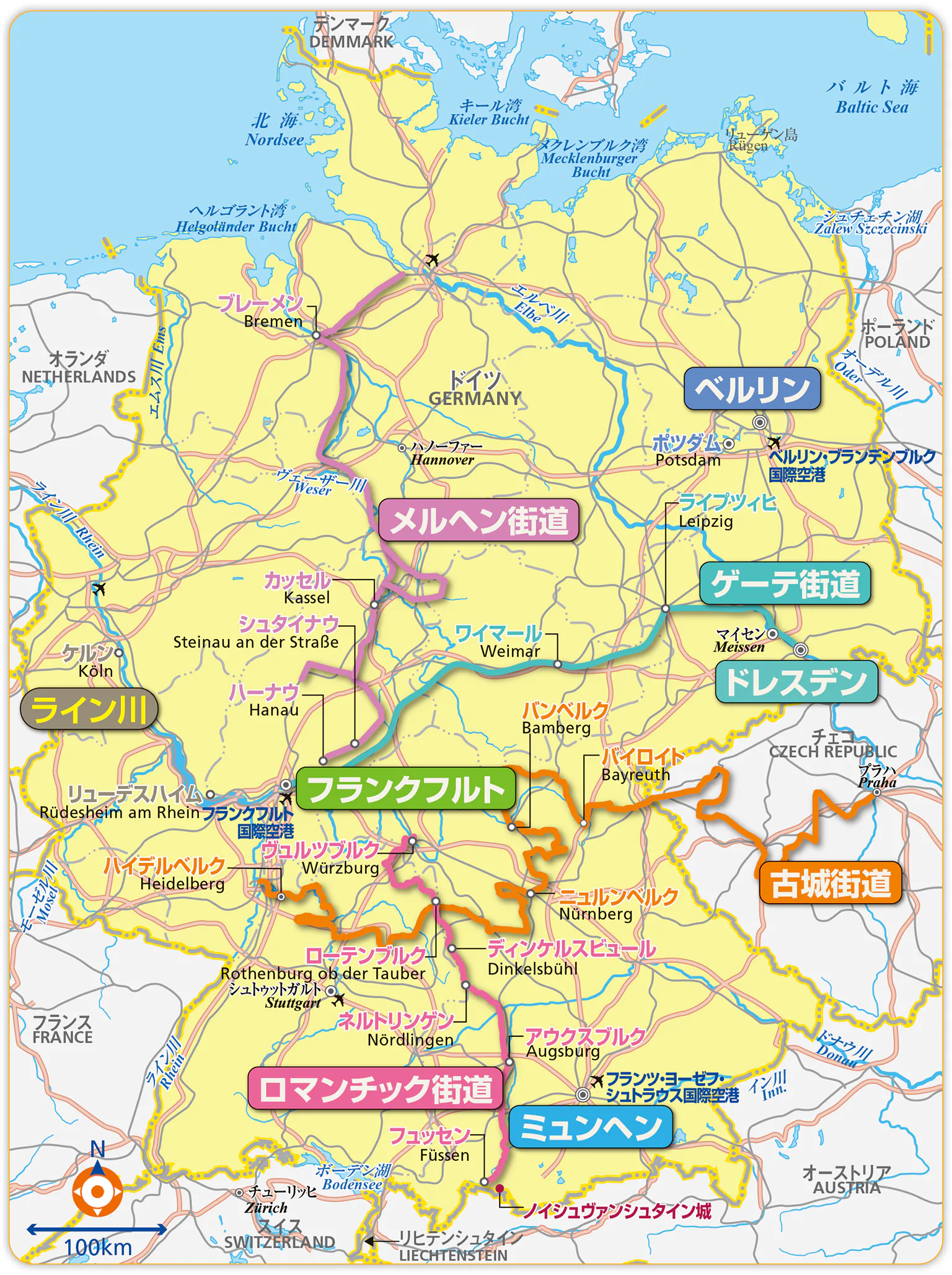ヴュルツブルクからフュッセンまで全長約350㎞の街道。中世の面影を残す街が多く、世界中の人が訪れる人気街道だ。おとぎの国の城のようなノイシュヴァンシュタイン城も必見。