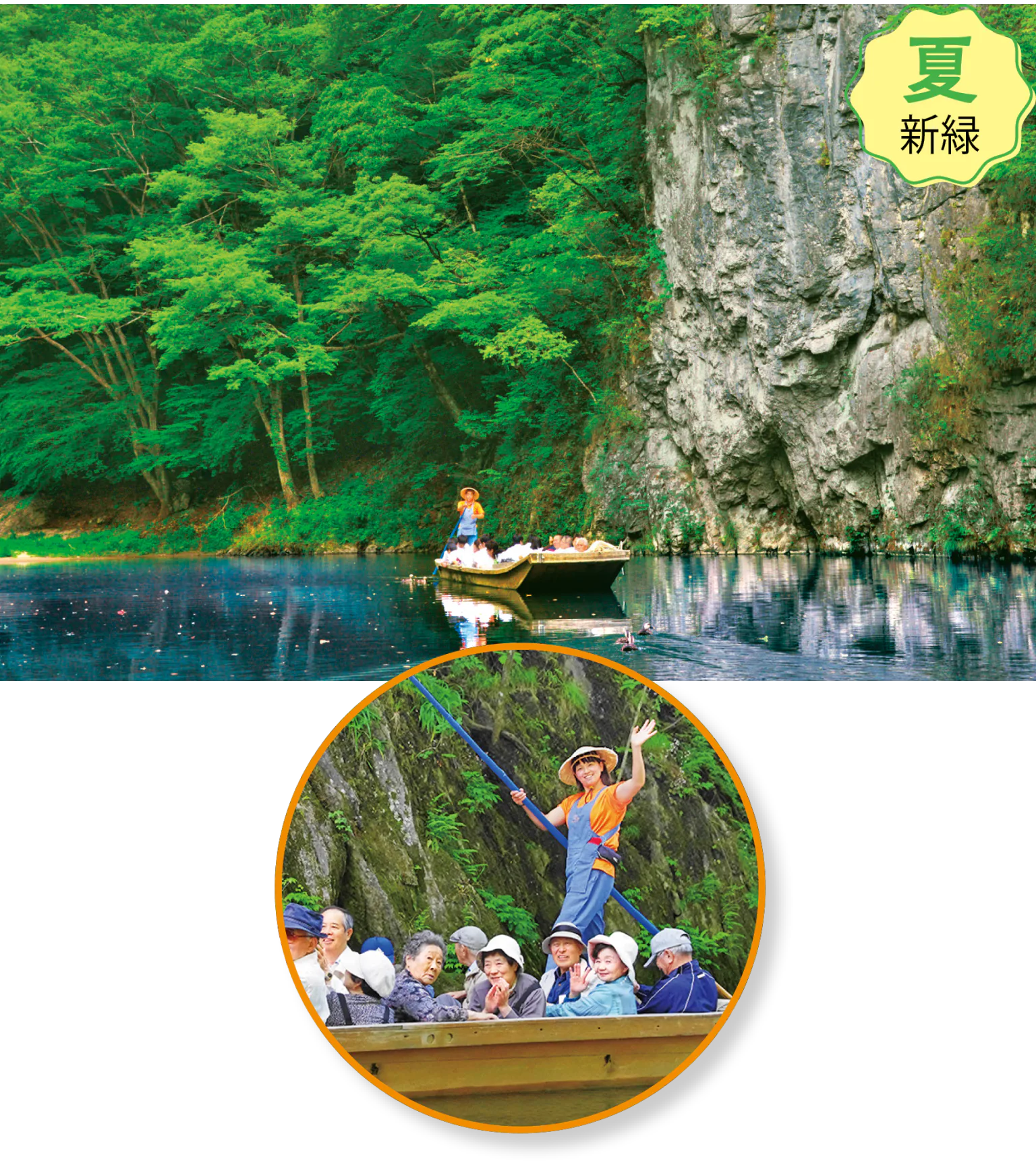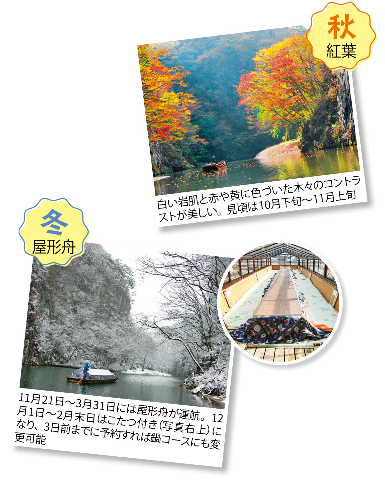 約2kmにわたって続く深山幽谷の風景を1時間30分ほどの舟旅で堪能できる。あたりはしんと静かで、川面を渡る風の音や鳥のさえずりがよく聞こえる。絶景の中で聴く船頭さんの舟歌に心も癒やされる。