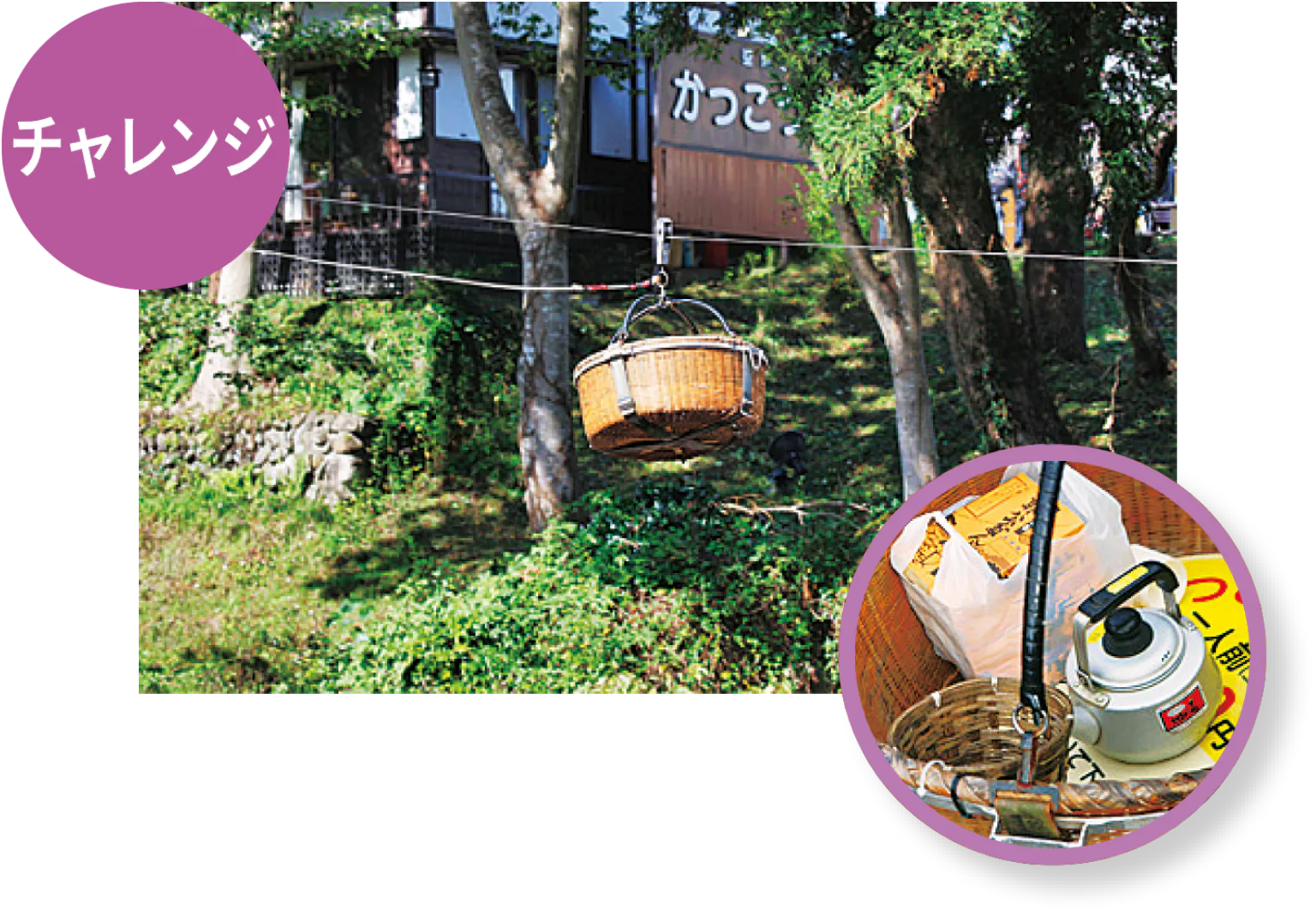 天工橋たもとの休憩所で籠にお金を入れて木板を叩くと、対岸の茶屋からケーブル伝いに名物の 「かっこうだんご」が飛んでくる。