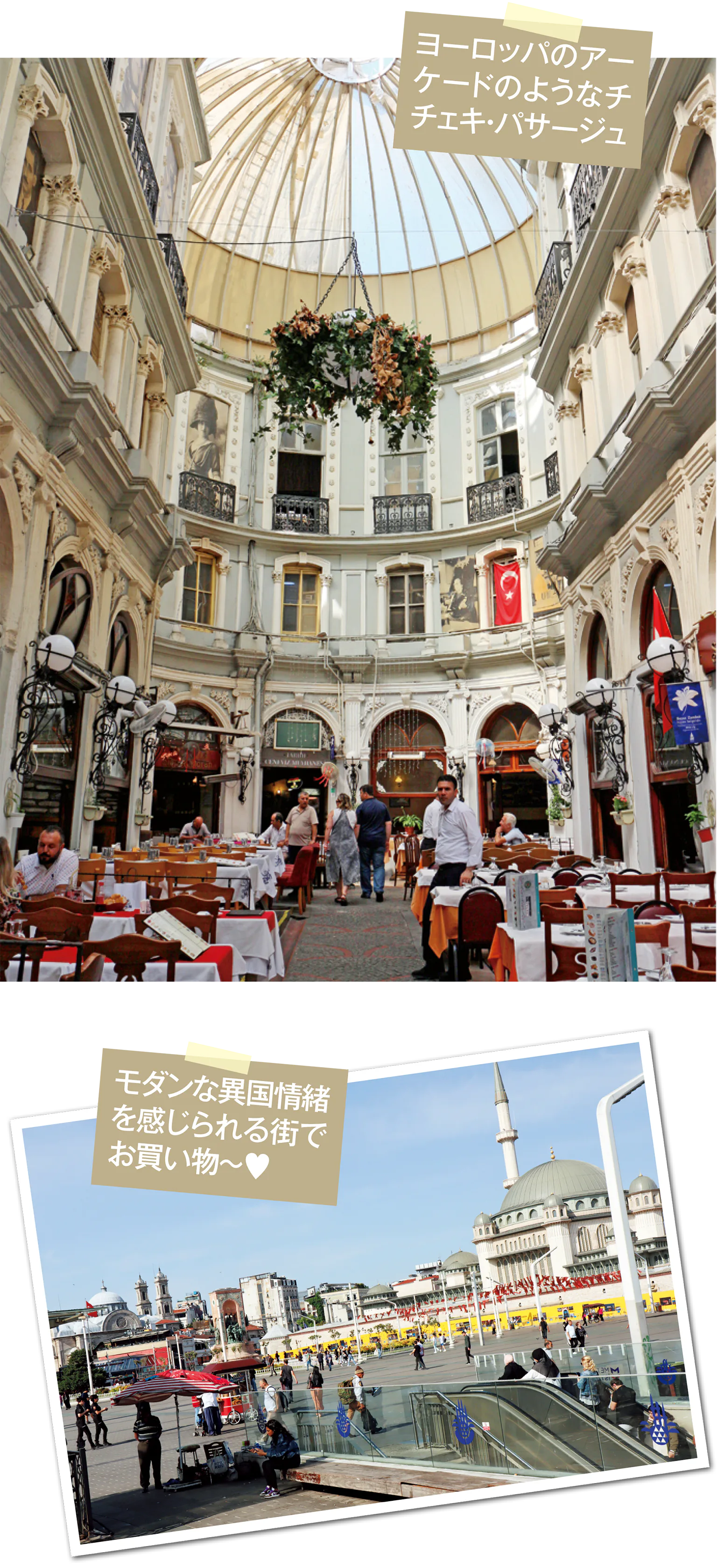 金角湾を挟んで、旧市街の対岸に広がる比較的新しいエリア。繁華街のイスティクラル通りを中心に、トルコの旬を感じられる、おしゃれなスポットが点在している。