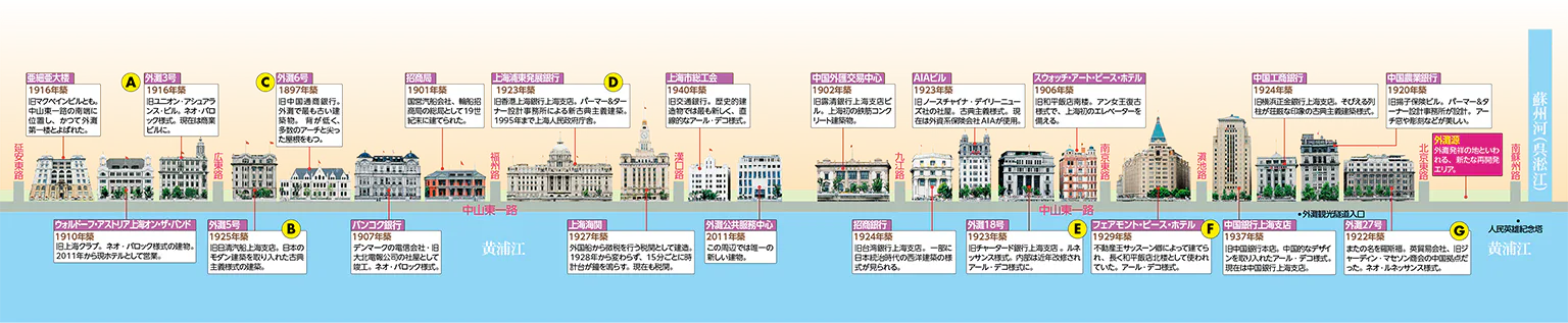 “外灘3号”“外灘5号”といった名称は、建物の住所から(※現在の住所と番号がずれるものもある)。いつしか慣用的に住所でよばれるようになったビルも多い。リノベーションの際、正式名称を変更したものもある。