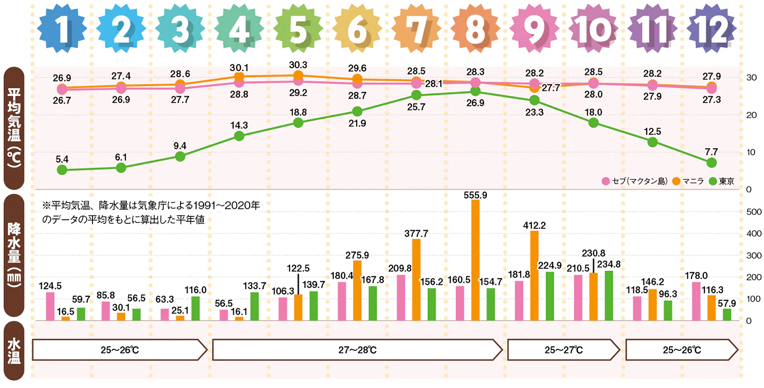 乾季は晴れる日が多く日本の初夏のようで過ごしやすい。6~10月の雨季は1日に何度かまとまった雨が降るが、晴れ間がのぞくことも多い。特にセブはマニラほど明確な雨季はない。