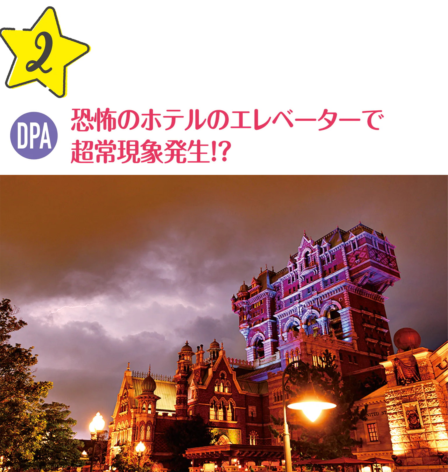 オーナーの失踪以来、閉ざされていたホテルで見学ツアーを開催。ゲストが乗り込んだエレベーターが突如急降下・急上昇を繰り返す。 ※身長102cm未満の方はご利用になれません。ほか制限あり。