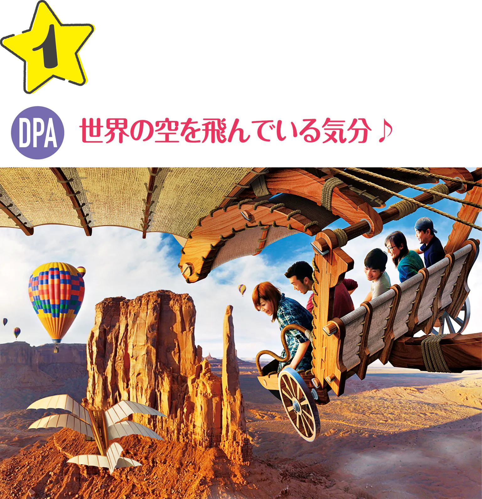 海外のディズニーテーマパークで大好評の大型アトラクション。風や匂いなども再現したリアルな世界で、各地を巡る空の旅に。 ※身長102cm未満の方はご利用になれません。ほか制限あり。