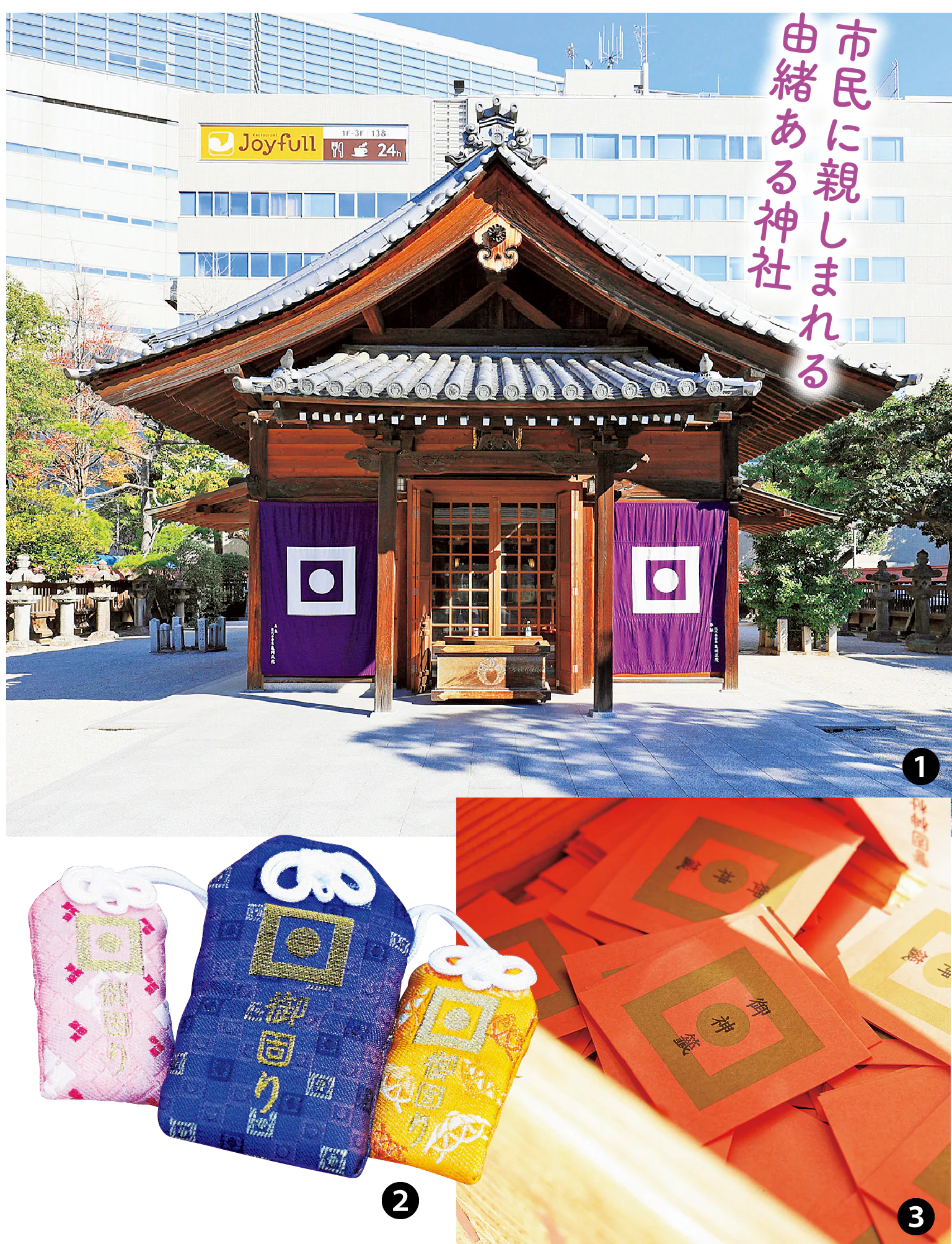 福岡一の繁華街・天神エリアの中心に鎮座。古くから、厄除・強運の神様として広く知られている。