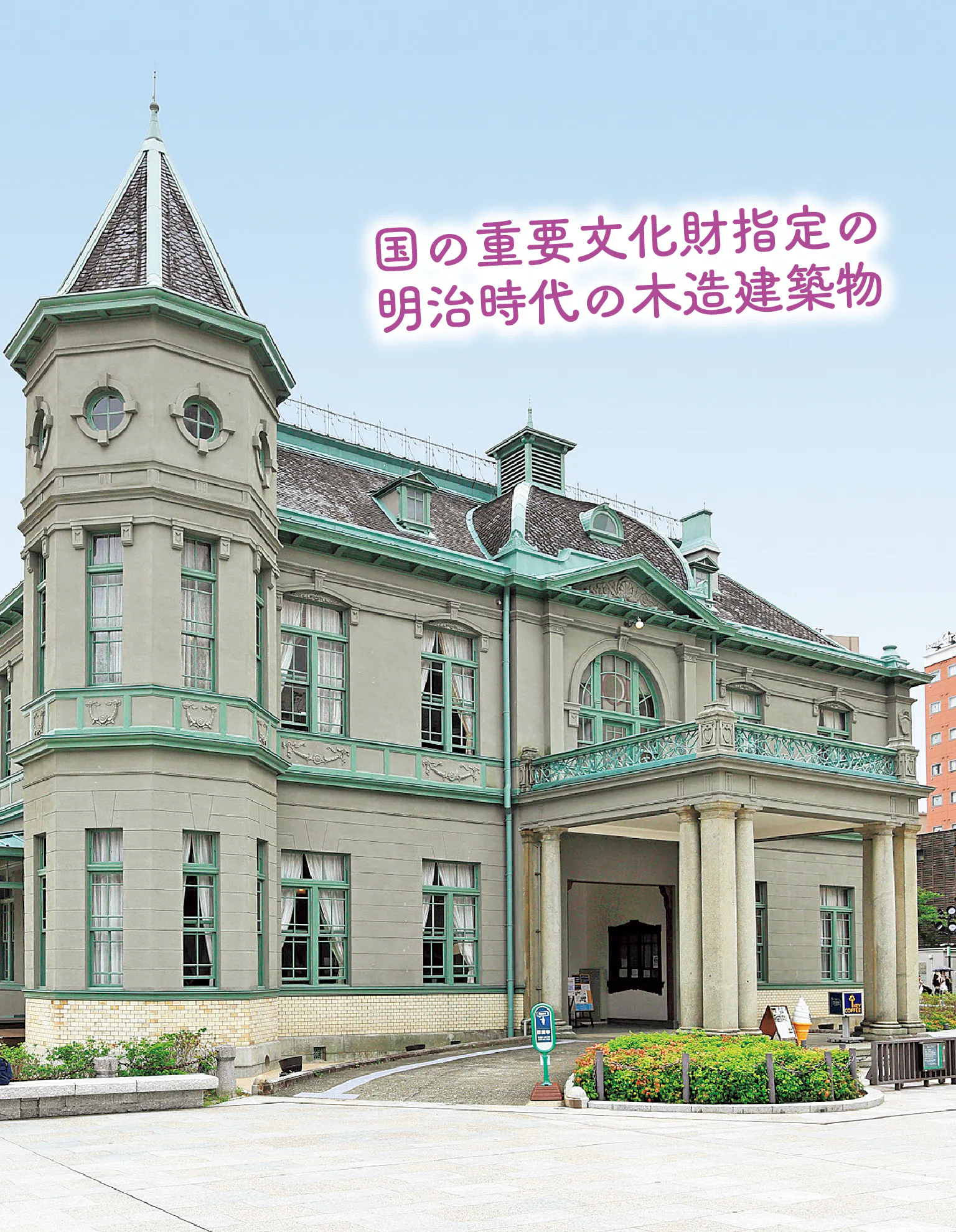 明治43年(1910)に建てられたフレンチルネサンスを基調とした木造建築物。貴賓室や広間などの内部見学はもちろん、レトロ衣装体験も行っており、明治の歴史情緒に浸ることができる。貴賓室は重厚な雰囲気。天井に書かれた青空と雲の絵は要チェック。