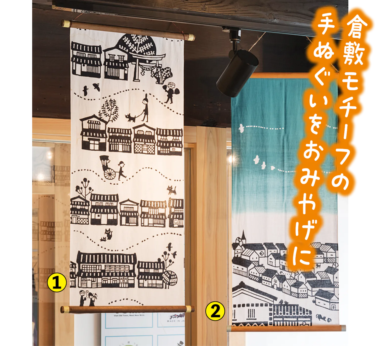 オリジナルや全国からセレクトした作家ものなど、約300種の手ぬぐいのほか、器などを販売。ポップな柄から古典柄まで種類豊富なので、お気に入りを見つけて。複合施設・クラシキクラフトワークビレッジの1階にある。