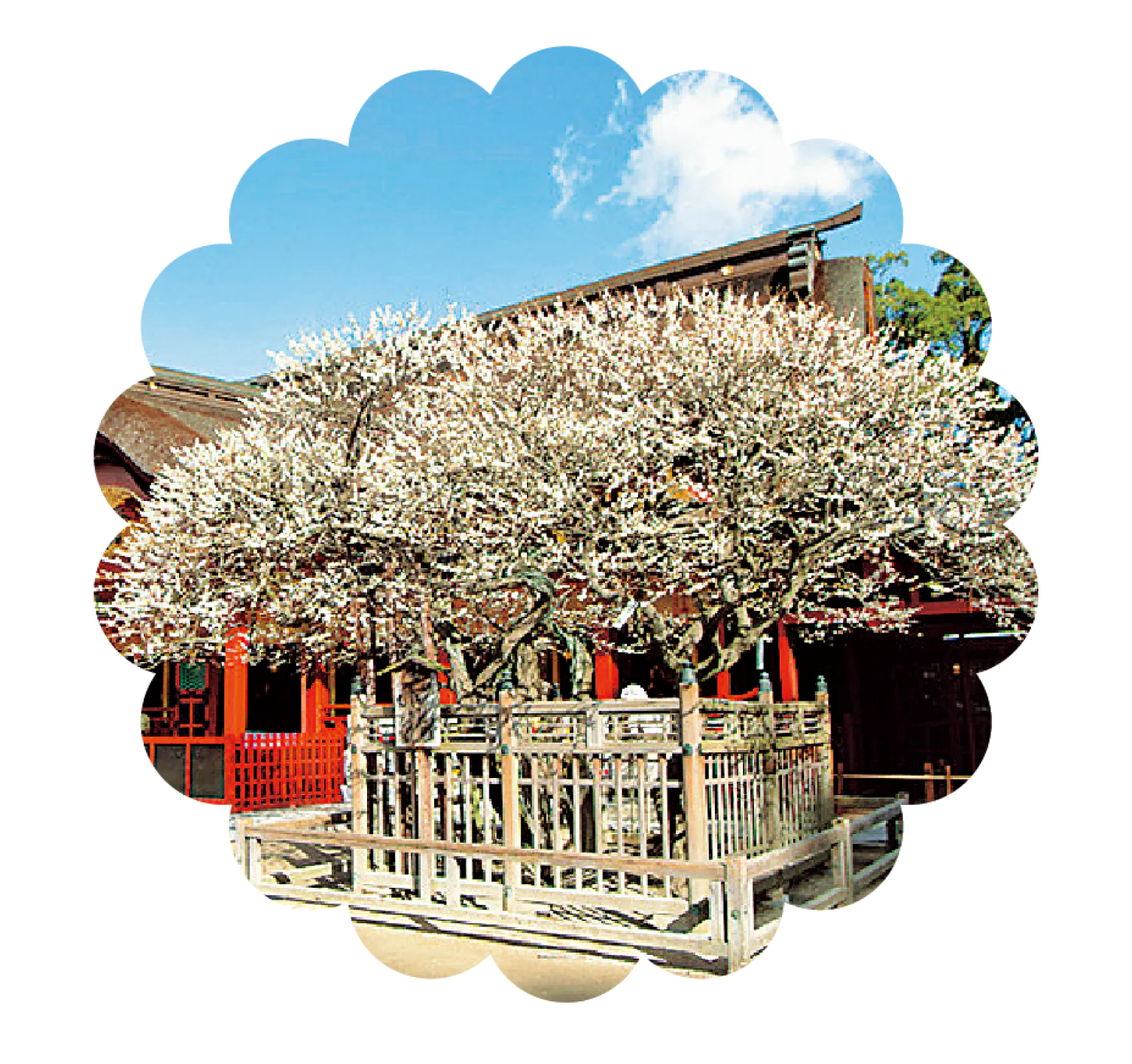 本殿に向かって右にある梅の木が御神木の「飛梅」。太宰府に左遷された道真公を慕って京の都から一夜にして飛んできたといわれる。梅は極早咲きから極遅咲きまで、約200種6000本が順次咲き誇る。御神木「飛梅」の開花が最も早く1月中旬。