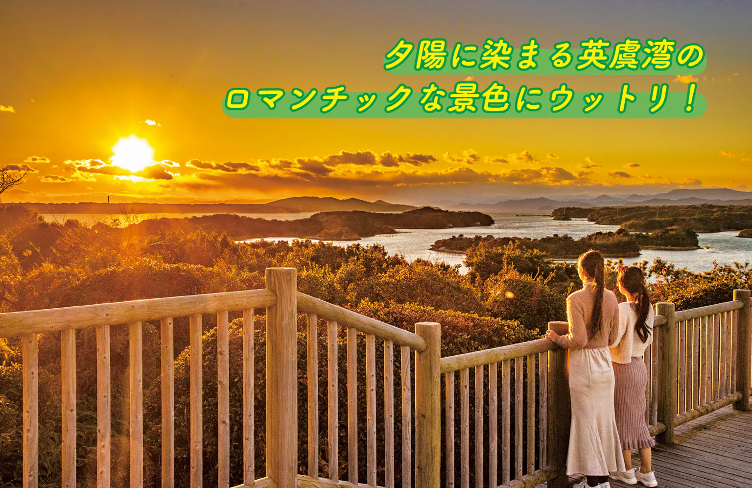 英虞湾に向かって西向きの展望台は夕陽の名所として有名。夕暮れ時に、刻一刻と変わる景色は、海や島々をオレンジ色や赤色、紫色などに染め上げて息をのむほど美しいと評判。天気の良い日は多くの人がカメラと三脚を持って撮影に訪れる。