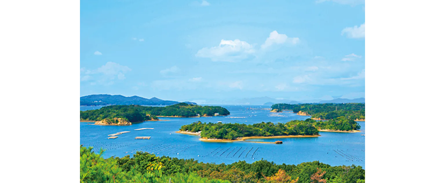 志摩市南部のリアス海岸に囲ま れた内海で、湾内には大小約60もの島々が浮かんでいる。これらの島々のうち人が暮らす有人島は、賢島、間崎島の2つで、賢島は本土と橋で繋がっている。全域が伊勢志摩国立公園内で、湾を取り囲むさまざまな場所からその絶景を楽しむことができる。昔から真珠の養殖でも有名な場所で、賢島は2016年の伊勢志摩サミットの舞台にもなった。