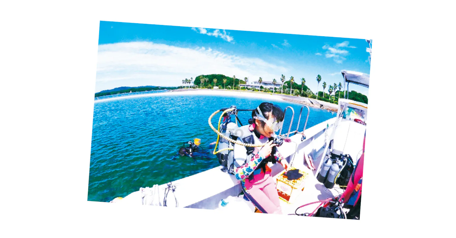賢島本店の目の前にある桟橋からボートに乗って、英虞湾に浮かぶ間崎島へ。体験ダイビングは通年開催しており、経験豊富なインストラクターの付き添いのもと、波の穏やかなポイントで気軽にダイビングが楽しめる。