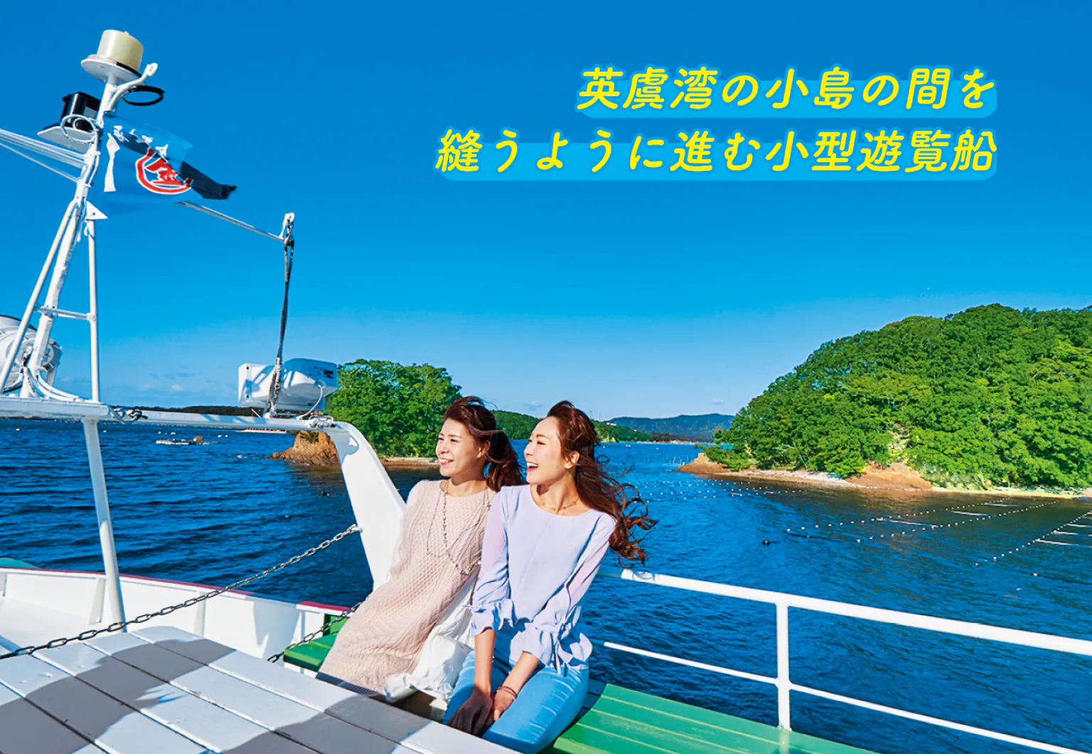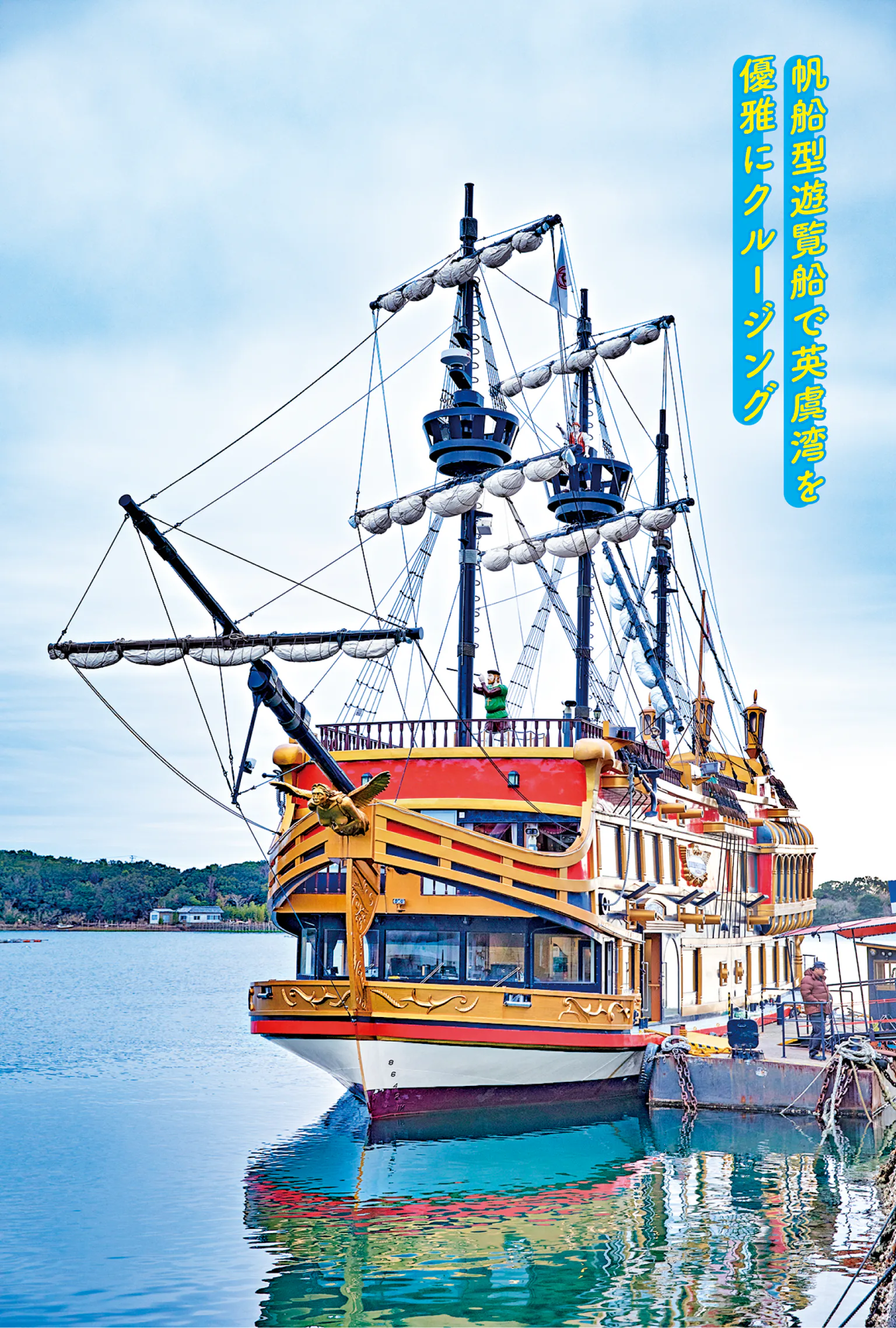 賢島港から出港する帆船型の遊覧船・エスペランサの展望デッキから、風光明媚な英虞湾の景観をたっぷり眺めることができる。より優雅なクルージングが楽しめる特別室「イサベラ」(大人500円)もある。