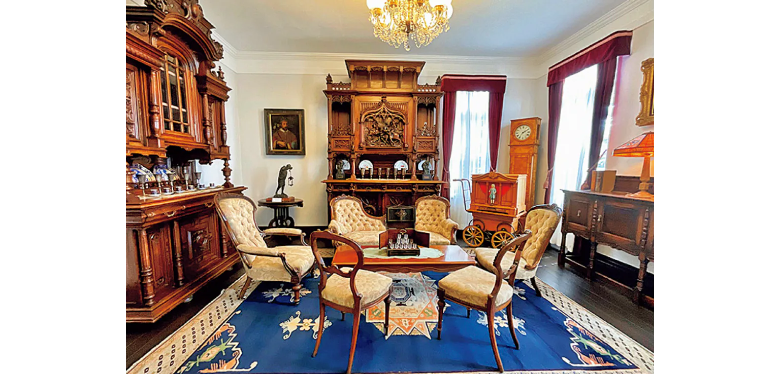 シャンデリアやアンティークな調度品など豪華で重厚なたたずまい