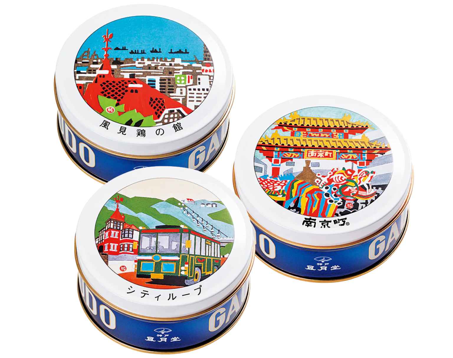 神戸の風景画などがデザインされた、ゴーフルの神戸限定ミニ缶