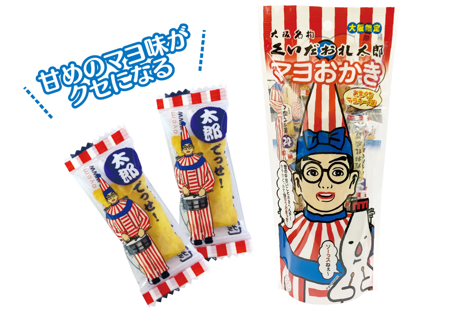 マヨおかきの大阪限定パッケージ。砂糖醤油ソースとマヨネーズの味がマッチ!