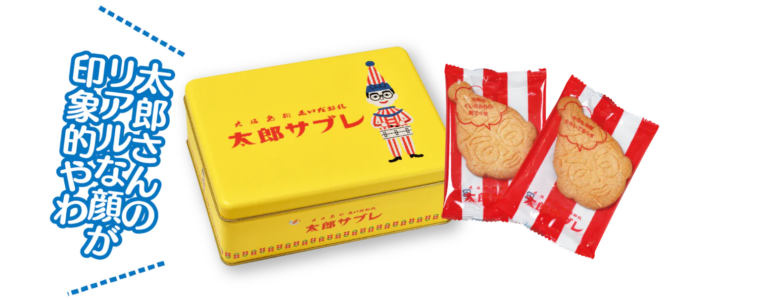 くいだおれ太郎の表情を楽しめるサブレは、サクッと軽い食感。レトロな黄色い缶もすてき
