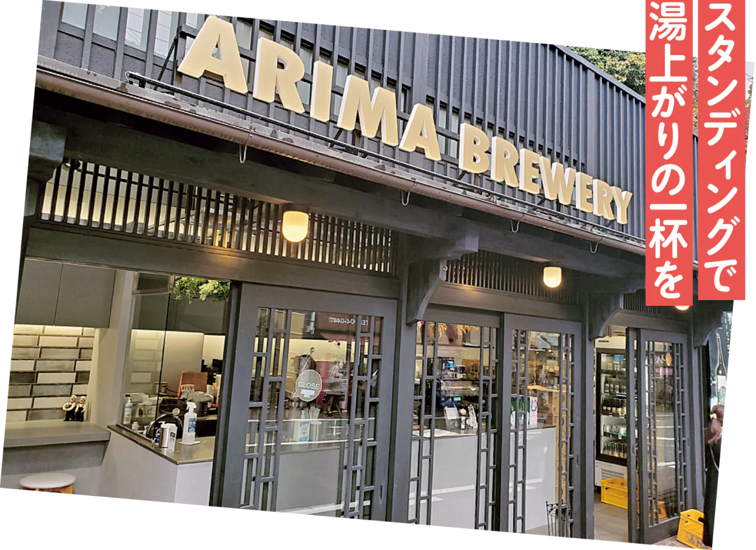 「酒市場」が温泉街のクラフトビール専門店としてリニューアル。「有馬麦酒・ジャパンエール」をはじめ、ブラックエールやホワイトエールなど、味わいの違うビールも楽しめる。店内にある酒は購入可能なのでおみやげにもぴったりだ。