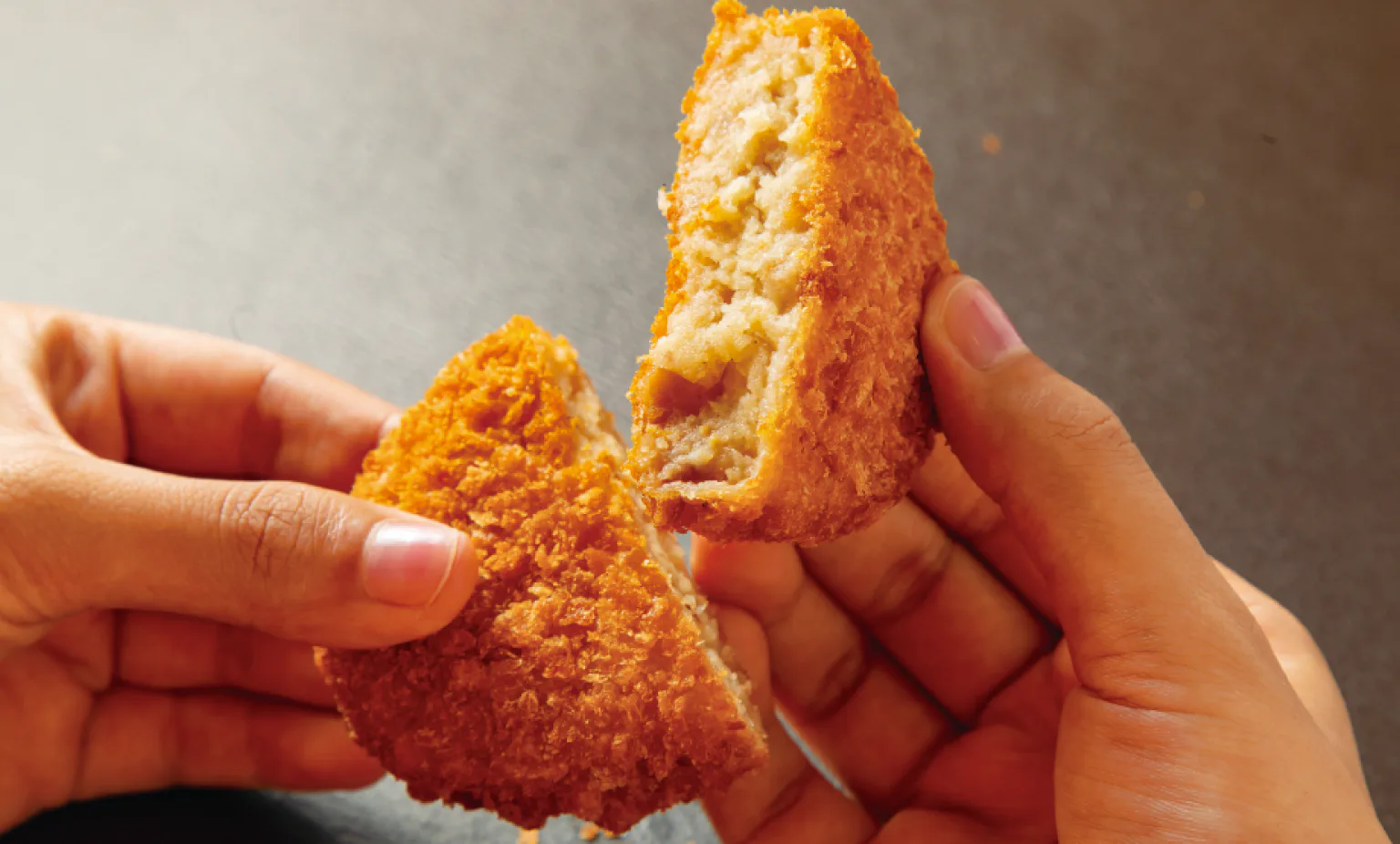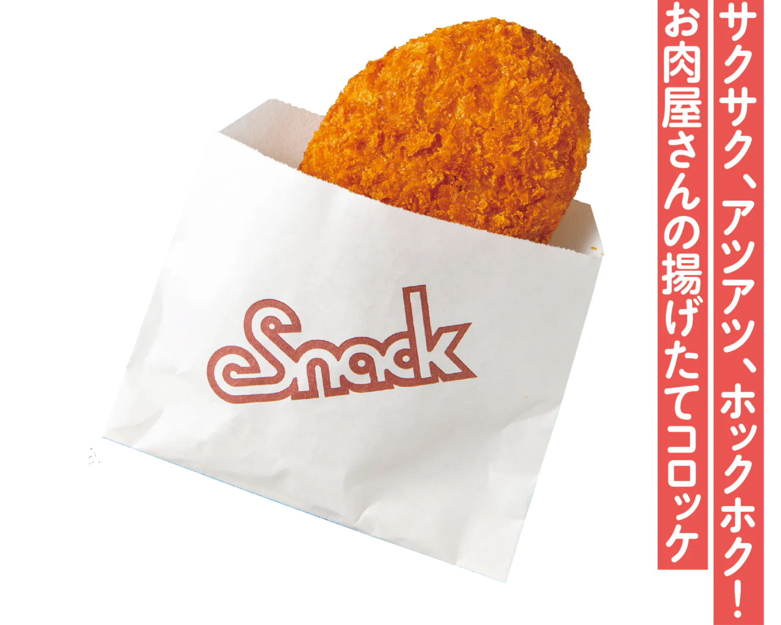 80年以上の歴史をもつ和牛専門店の真向かいで、揚げたてのコロッケを提供。カラッと揚げたビーフコロッケ170円は、黒毛和牛のうま味とジャガイモの甘みがたっぷり!ジューシーなミンチカツ330円も見逃せない。
