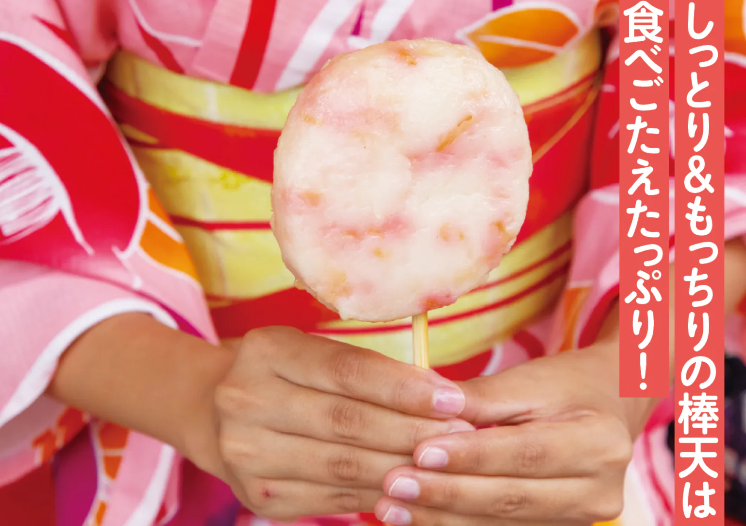 最上級ランクのシログチ・イトヨリダイのみを主原料に使用し、昔ながらの石臼ですりあげたすり身にこだわる。じゃがバター・チーズ・きくらげ・野菜かきあげ・えびふきよせなどが揃い、どれも目移り必至!