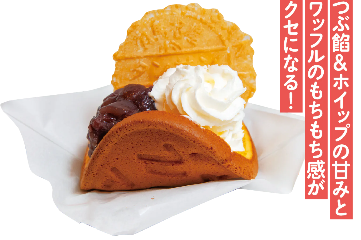 炭酸煎餅の老舗「三津森本舗」が手がける甘味処。食べ歩き限定の炭酸和ッフル350円は、ワッフルに、つぶ餡、ホイップをサンドした逸品。炭酸煎餅の食感がアクセントに。