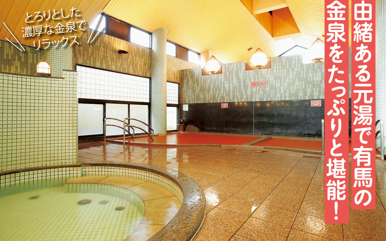 有馬に湧く温泉は「金泉」と「銀泉」の2種。鉄分を多く含む茶褐色の「金泉」は塩分濃度が高く美肌効果が期待でき、無色透明のラジウム泉「銀泉」は新陳代謝を高める効能があるといわれている。