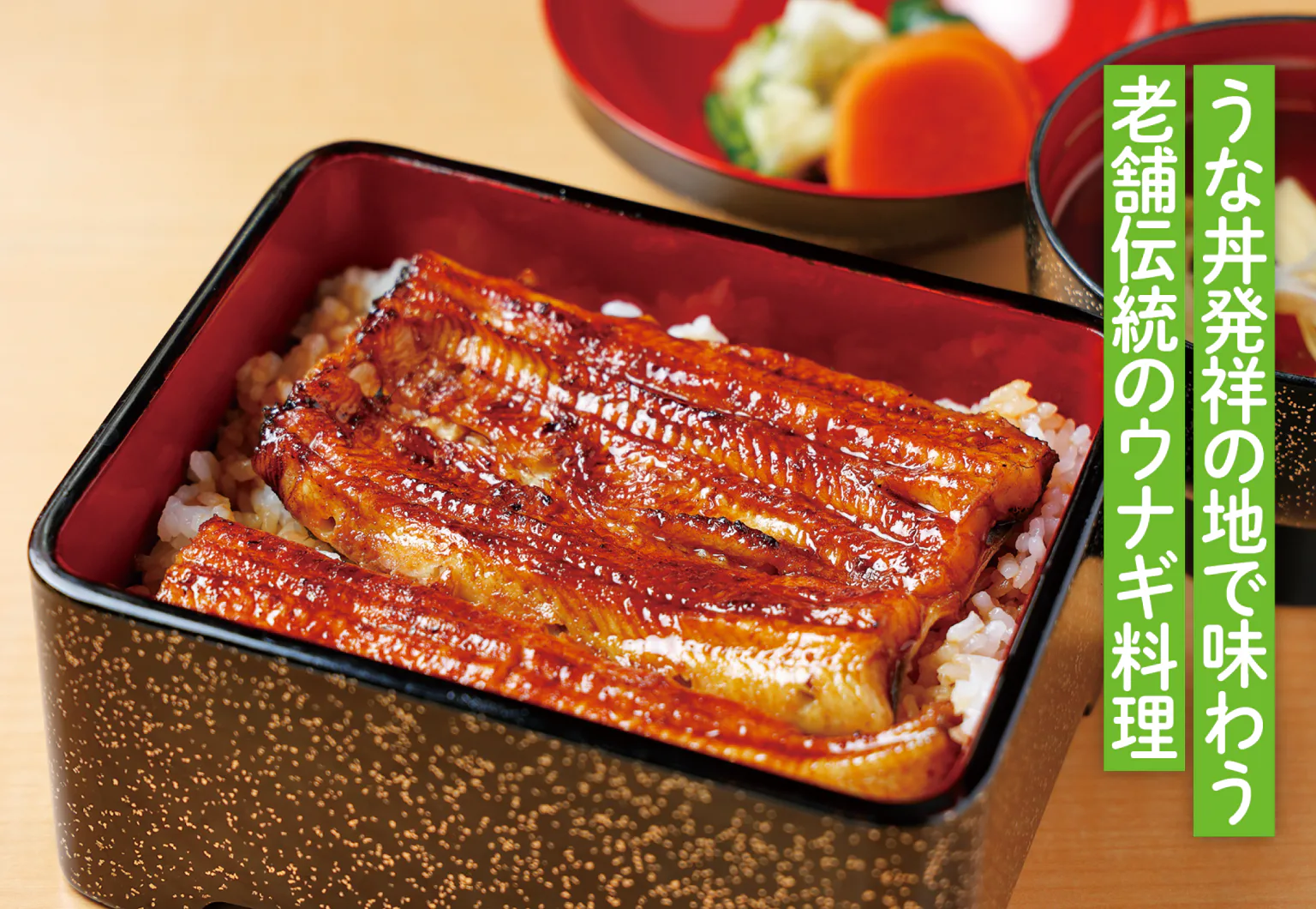 ウナギの香ばしさを際立てるタレ。米は特別栽培米のつくば産コシヒカリを使用。