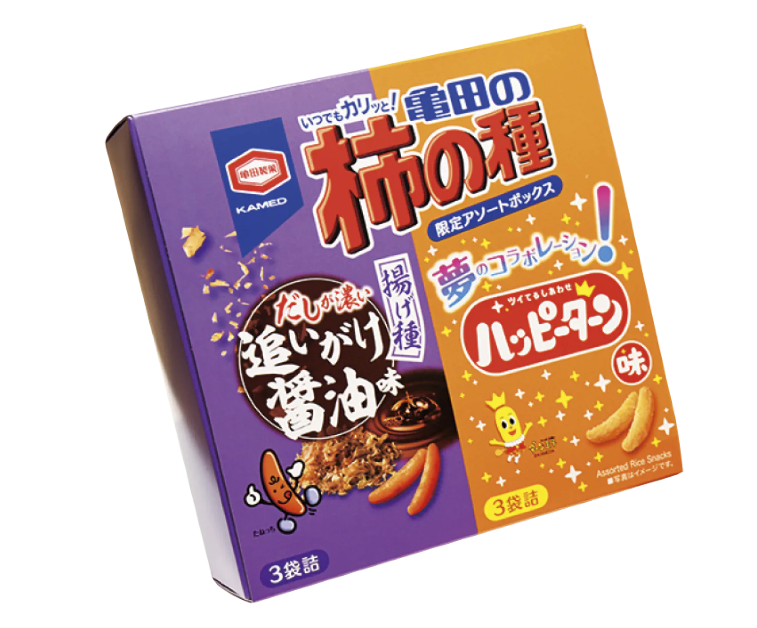 揚げ種追いがけ醤油味とハッピーターン味の柿の種が3袋ずつ