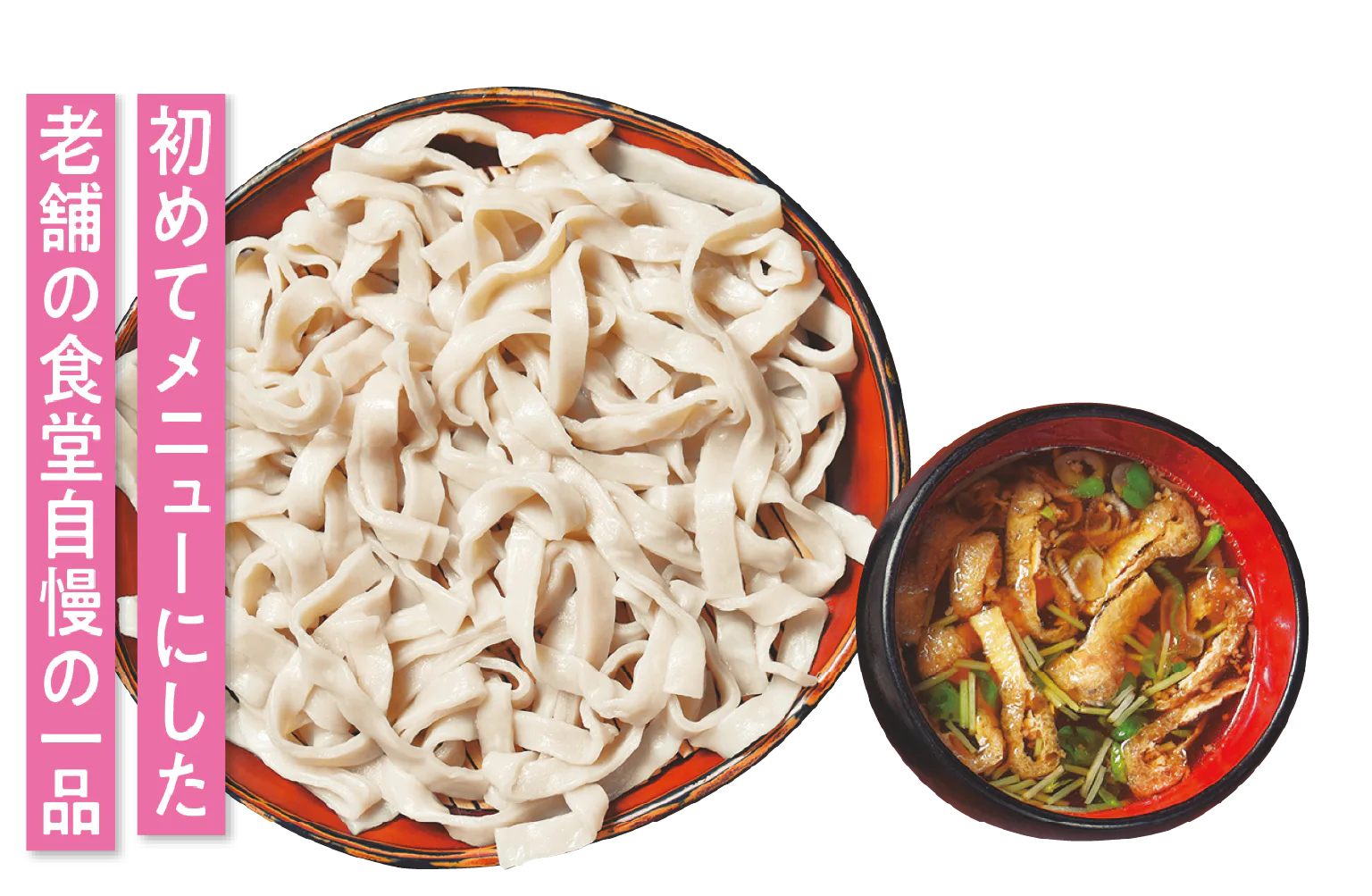 冷水でしめたほうとうの麺を温かい醤油ベースの風味豊かなつゆにつけていただく味わい深い一品。