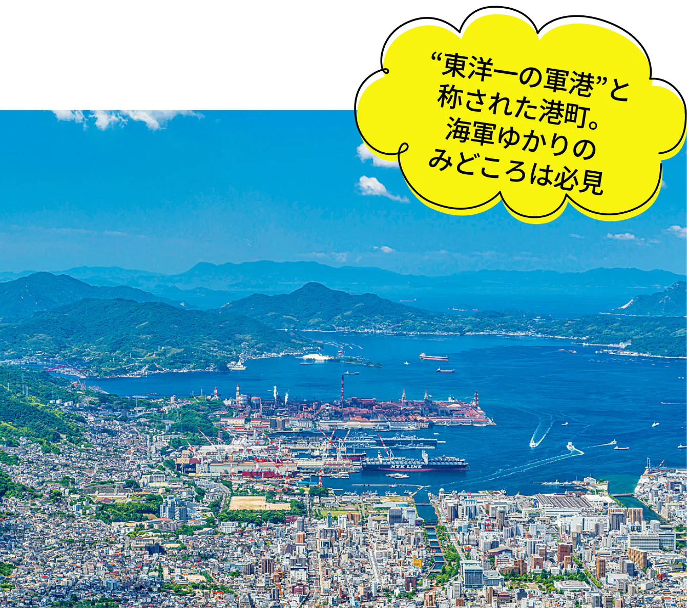 かつて東洋一の軍港として栄え、数々の艦艇が造られた港町。旧海軍や海上自衛隊ゆかりの施設は見ごたえ十分だ。旧海軍ゆかりのグルメや、名物おやつも味わおう。【交通】JR広島駅から鉄道で約30〜60分