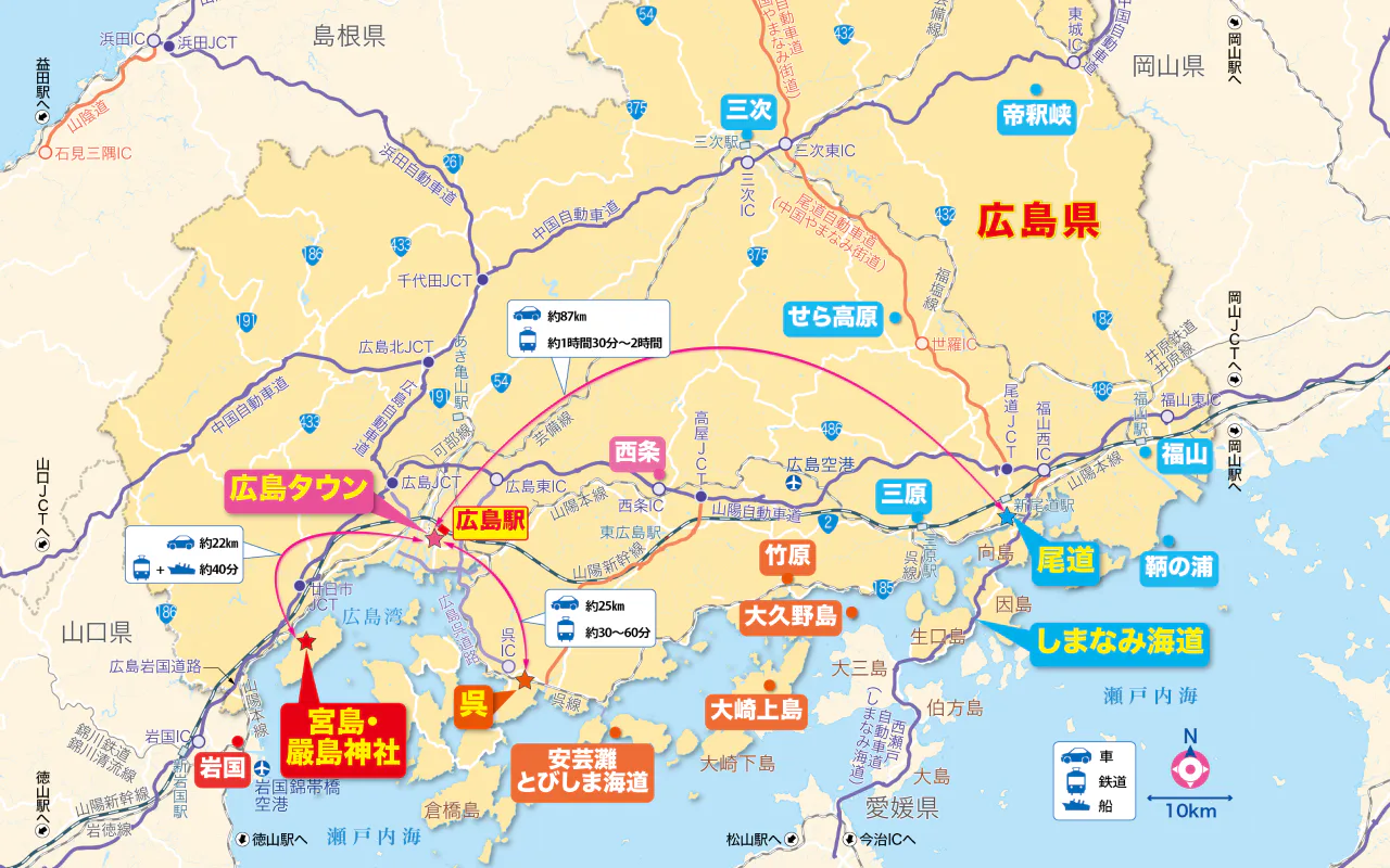 広島へは新幹線で東京から約4時間、大阪から約1時間30分。瀬戸内海沿岸の移動には鉄道が便利。島々や山間部へは車利用がキホン。