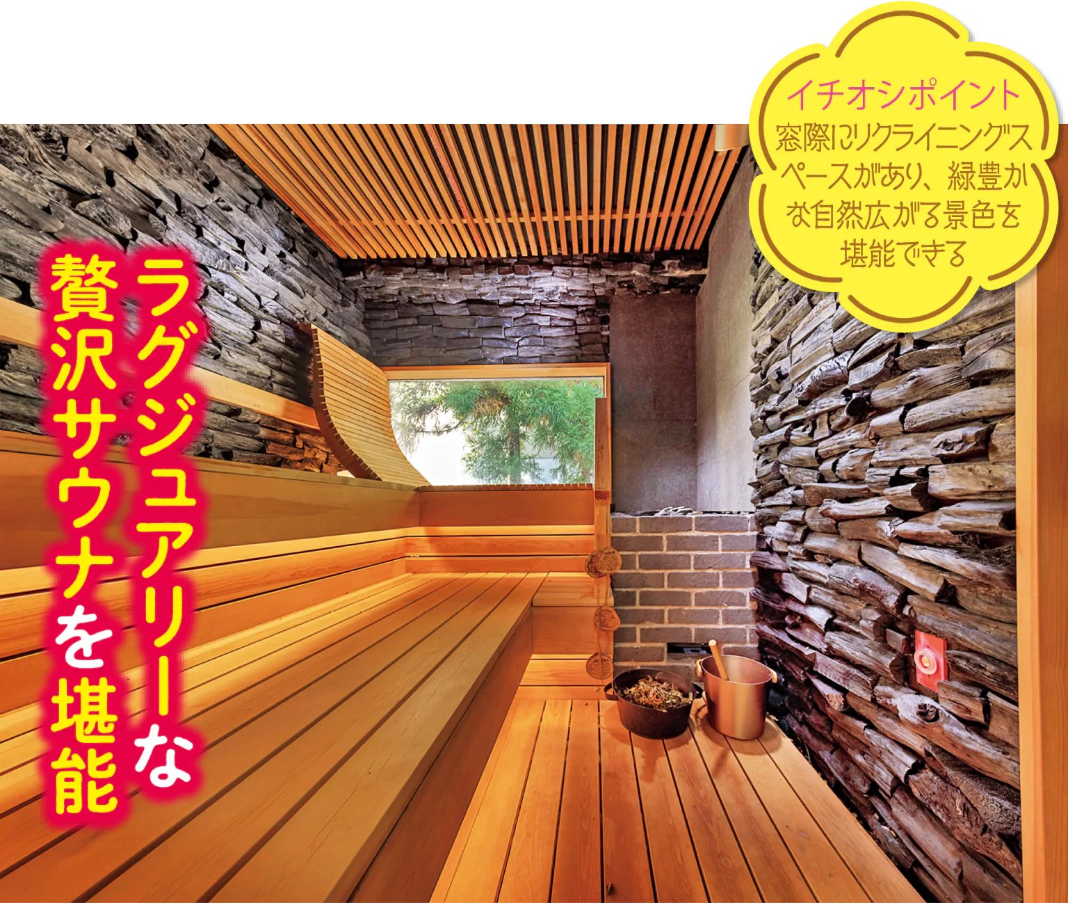 自然を感じられるこだわりが詰まった個性的なサウナ。日頃のストレスを忘れて、心もからだもリラックスしよう。